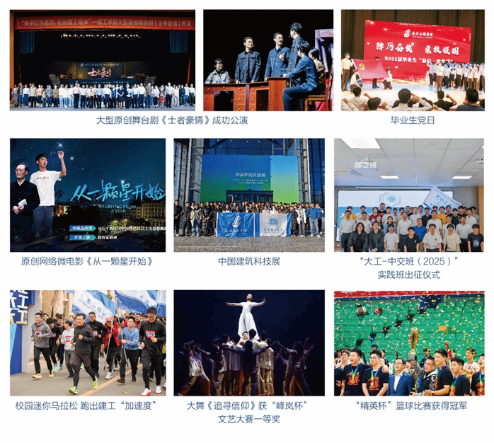 以向上向阳文化育人。传承红色基因,弘扬建工精神,原创舞台剧《士者豪情》获中科协推荐;原创网络微电影《从一颗星开始》获教育部一等奖,打造“毕业生”党日等多教育品牌,夯实理想信念根基。发挥校企合作实效性,搭建寒暑假社会实习实践平台,锤炼奋斗品格;打造“活力建工”向上文化,以“校园马拉松”、“篮球赛”、“足球赛”为载体,以体育人展现青春风采。